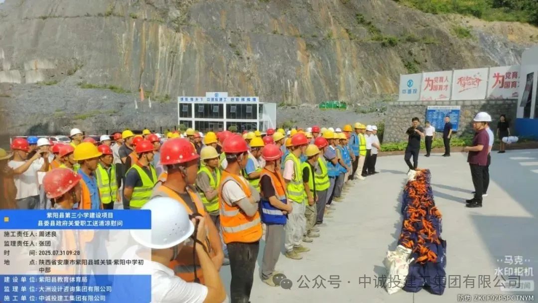 7月31日上午,紫陽縣縣委書記向德剛率隊,帶領縣總工會、教體局等相關部門負責人組成的送清涼慰問組,來到中誠投建工集團承建的紫陽縣第三小學項目現場,開展“夏送清涼”慰問活動