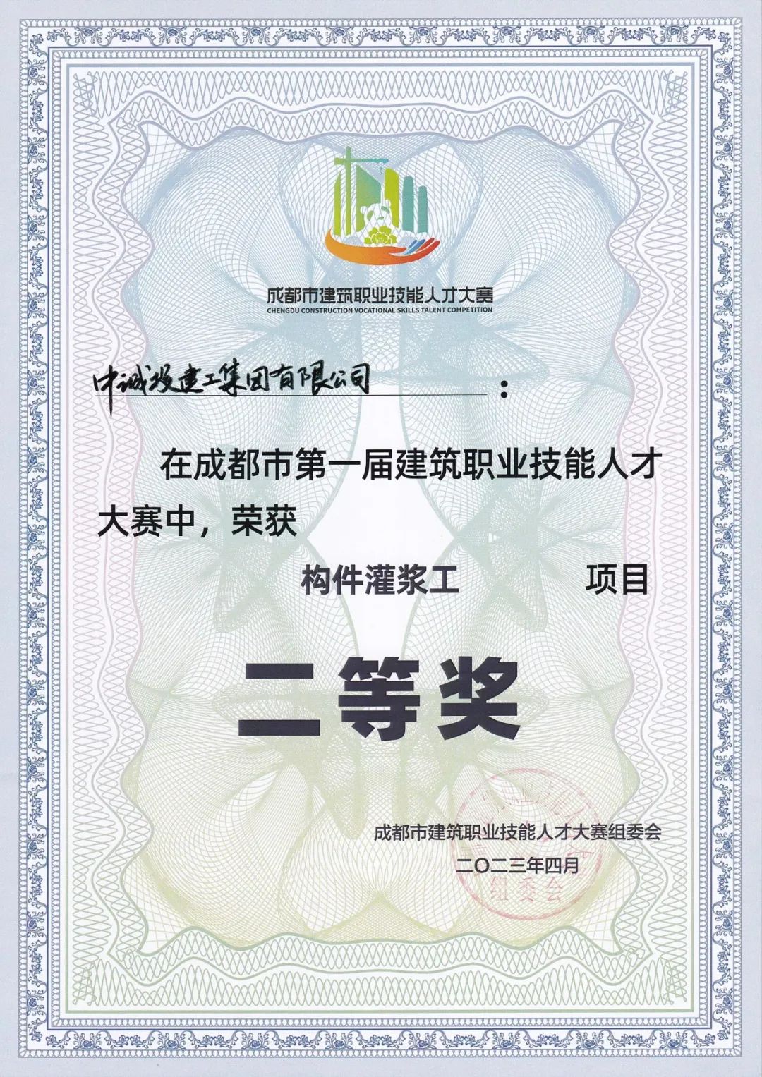 4月21日,成都市第一屆建筑職業技能人才大賽圓滿落幕。中誠投建工集團榮獲“團體優勝”獎,參賽員工楊杰、謝學松榮獲構件灌漿工“二等獎”。